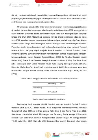 WĂĚĂŶŐ >ĂǁĂƐ hƚĂƌĂ Ϯ͕ϱϱϬ͕ϳϭϴ Ϯ͕ϳϲϳ͕ϳϴϰ Ϯ͕ϳϲϳ͕ϳϴϰ Ϯ͕ϳϲϴ͕Ϭϵϱ Ϯ͕ϵϱϵ͕ϵϮϬ Tabel 5.4 Hasil Pengujian Korelasi Kemantapan Jalan terhadap Investasi
